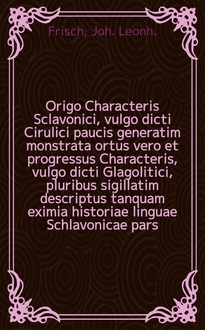 Origo characteris Sclavonici, vulgo dicti Cirulici paucis generatim monstrata ortus vero & progressus characcteris, vulgo dicti Glagolitici, pluribus sigillatim descriptus tanquam eximia "Historiæ linguæ Sclavonicæ" pars occasione orationum quas in gymnasio Berlinensi, die II. April, MDCCXXVII ... collegæ nuper promoti, habebung ...