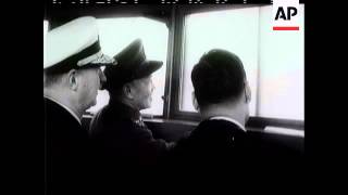 LS of unidentified warship at sea. HAS of party coming aboard - Taiwanese officials ? They shake hands with captain of ship. MS of Chiang Kai-shek meeting ...