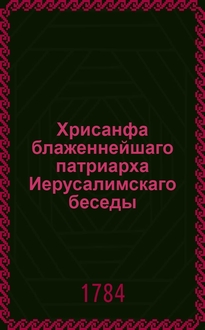 Хрисанф Нотара ; Chrysanthus Notaras. Хрисанфа блаженнейшаго патриарха Иерусалимскаго беседы, : Токмо некоторыя сысканныя / И тщанием блаженнейшаго и святейшаго патриарха Мелетиа Иерусалимскаго ж в печать изданныя;; С греческаго же на российский язык переведенныя в Москве, 1782 года [Моисеем (Гумилевским)]. - М. : Иждивением Н.Новикова и Компании Унив. тип., у Н.Новикова, 1784. - 8° см