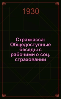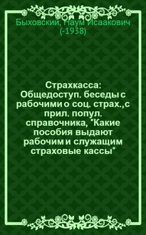 Быховский Н.И. Страхкасса : Общедоступ. беседы с рабочими о социал. страховании, и попул. справочник о том какие пособия выдают рабочим и служащим страховые кассы / Н.И.Быховский. - 4-е изд. - М. : Вопр. труда, 1925. - 112 с., [1] с. на обл. : диагр. ; 18 см