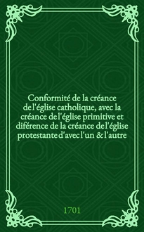 Conformité de la créance de l'église catholique, avec la créance de l'église primitive et diférence de la créance de l'église protestante d'avec l'un & l'autre. T. 2