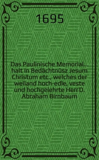 Das Paulinische Memorial ... halt in Gedächtnüβ Jesum Christum etc., welches ... D. Abraham Birnbaum, Churfl. Sächβ. hochbetraut-gewesenen Rath, fünff unterschiedener ... Durchl. Chur-Fürsten zu Sachsen bestallter ... Leib-Medicus, ... bey seinem am 11. Junii 1695. erfolgten Abschiede sehr wohl beobachtet, ... auch daher am Tage des ... Leich-Begängnüsses war der 30. selbigen Monats in der Kirchen zur L. Frauen in Dreβden ... vorgestellet