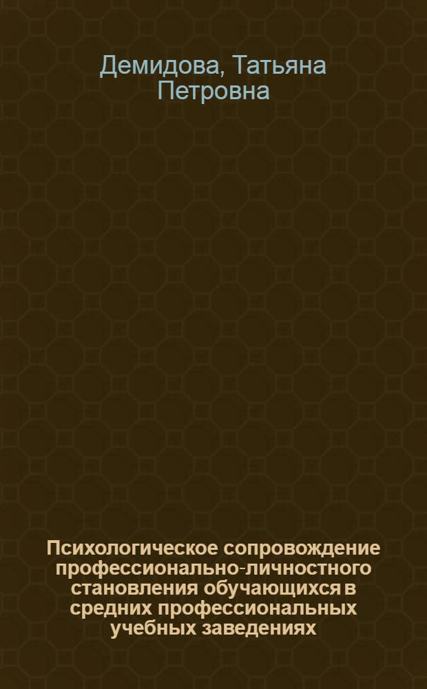Демидова Т. П. Психологическое сопровождение профессионально-личностного становления обучающихся в средних профессиональных учебных заведениях : учеб. пособие / Т. П. Демидова; Российская акад. образования, Московский психолого-социальный ин-т. - Москва ; Воронеж : Московский психолого-социальный ин-т МОДЭК, 2006. - 110, [1] с. : ил., табл. ; 20 см. - (Серия "Библиотека психолога"). - Библиогр.: с. 102-109