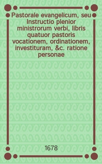 Luther M. Pastorale Lutheri, Das ist: Nützlicher und nötiger Unterricht von den fürnembsten Stücken zum heiligen Ministerio gehörig, Und richtige Antwort auff mancherley wichtige Fragen von schweren und gefehrlichen Casibus, so in demselben fürfallen mögen. : Für anfahende Prediger und Kirchendiener zusammen bracht, und auff beyderley Edition aller seiner Bücher zur Wittenberg und Jena gedruckt, auch die Eiβlebischen und andere Schrifften gerichtet. : Jetzr an vielen orten gemehret, und mit nützlichen schönen Tractaten gebessert / durch M. Conradum Portam, Pfarrern zu S. Peter und Paul in Eiβleben.; Sampt einem sonderlichen Register, und newen Vorrede M. Hieronymi Mencelli, der Graffschafft Manβfelt Superintendenten. - Gedruckt zu Leipzig : jn vorlegung Henningi Grossen, 1604. - [14], 445, [17] л. ; 4° (20 см) см. - Указ.: л. [1-14] (ряд 2-й)