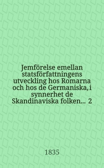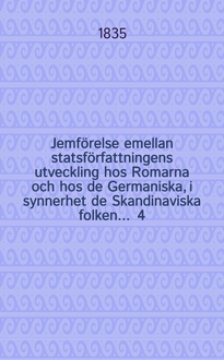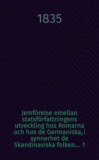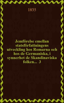 Jemförelse emellan statsförfattningens utveckling hos Romarna och hos de Germaniska, i synnerhet de Skandinaviska folken ... 5 : ... af Carl Gustaf Engeström, af Skånska Nationen ... den 18 Junii 1835.