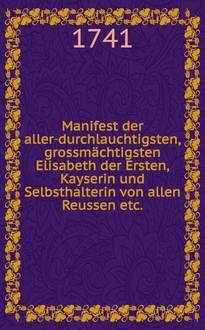 Der allerdurchlauchtigsten, grossmächtigsten grossen Frau und Kayserin Elisabeth Petrowna, Kayserin und Selbstherrscherin aller Reussen etc. Personalia, welche nachdem das kayserliche Leichenbegängniss in der Residenz St. Petersburg mit allen Solennitäten am 5ten Februarii c. a. vollzogen worden, in dem General-Gouvernement des Herzogthums Lieflands am 1sten Martii, als dem zu diesen Exequien angeordneten Tage in allen Kirchen und Gemeinen dieses Herzogthums abgelesen worden