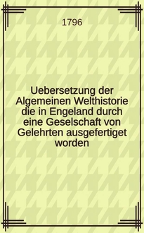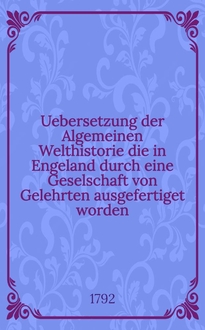 Uebersetzung der Algemeinen Welthistorie die in Engeland durch eine Geselschaft von Gelehrten ausgefertiget worden : Nebst den Anmerkungen der holländischen Uebersetzung auch vielen neuen Kupfern und Karten / Genau durchgesehen und mit häufigen Anmerkungen vermeret von Siegmund Jacob Baumgarten ... Th. 7:. - [1748]. - [2], [19], [1], 756 с
