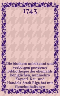 Die bisshero unbekannt und verborgen gewesne Bibliotheque der Käyserl. Kauf- und Handels-Stadt Riga