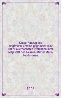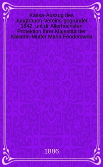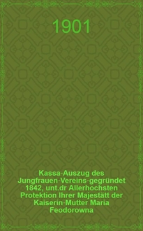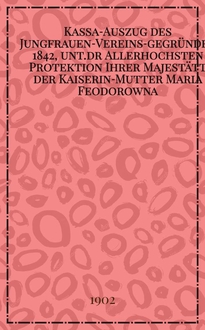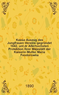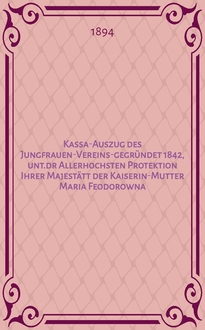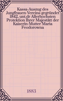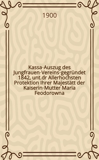 Kassa-Auszug des Jungfrauen-Vereins-gegründet 1842, unt.dr Allerhochsten Protektion Ihrer Majestätt der Kaiserin-Mutter Maria Feodorowna : Verschlag für das Arbeits-Bureau und die Mädchen-Gewerbeschule des Jungfrauen-Vereins. - Riga, 1883-1910