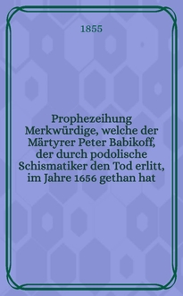 Prophezeihung Joh. Warners v. Beckendorff curieuse, welche er 1641. d. 19. Apr. von dem gantzen Römis : Reiche und insonderheit von Ihro Czaris. Maj. Hause und der itzo aufm Tapet seyenden Mariage mit einen teutschen Fürsten gestellet